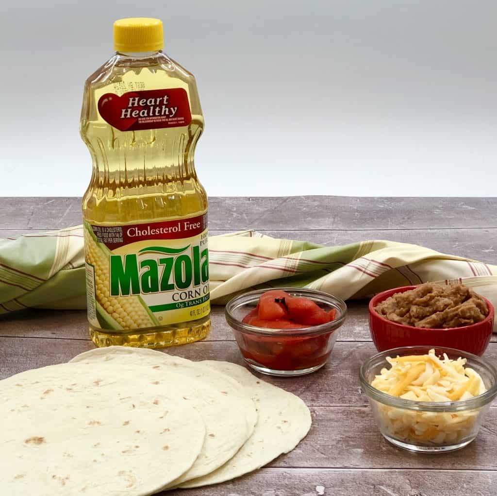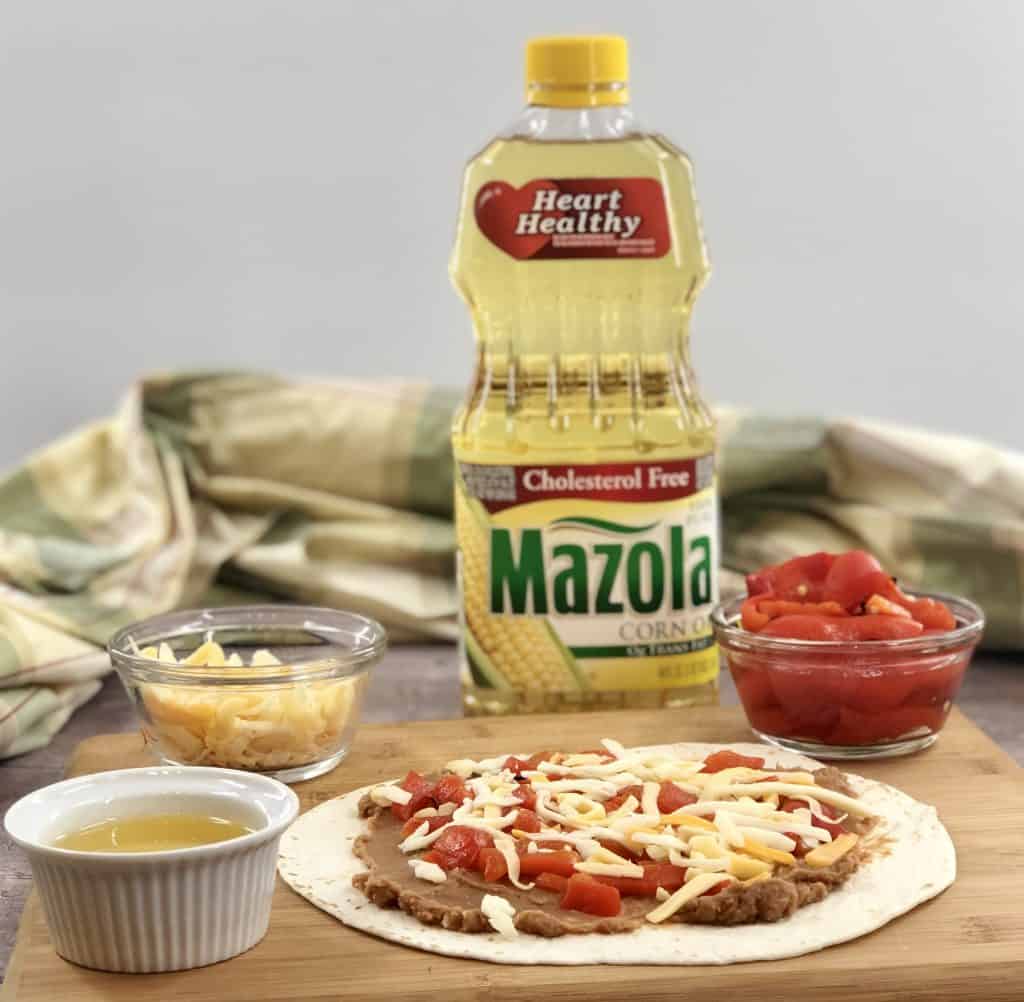 - Place the prepared quesadilla on a cookie sheet that has been lightly coated with Mazola Corn Oil. Repeat steps with the remaining tortillas. Depending on size of cookie sheet, this may need to be done in batches.