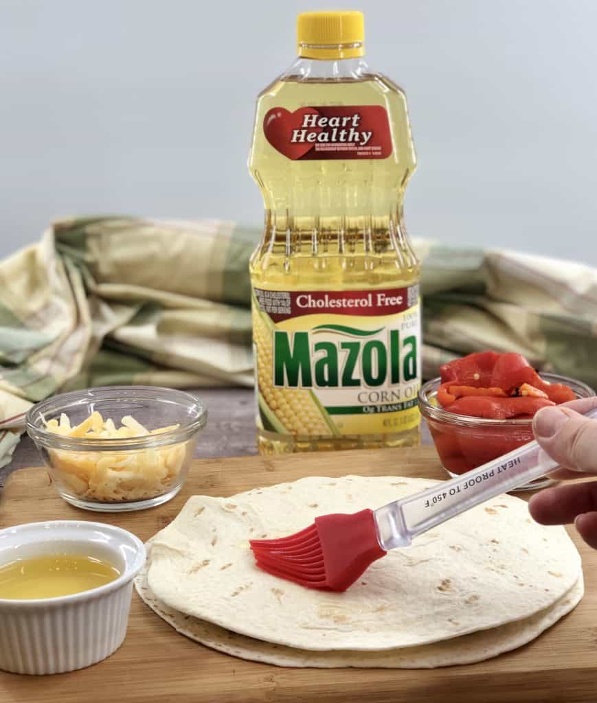 Place another tortilla on top and press down lightly. Then, brush the top of the quesadilla with Mazola Corn Oil using a basting brush. Place the prepared quesadilla on a cookie sheet that has been lightly coated with Mazola Corn Oil. Repeat steps with the remaining tortillas. Depending on size of cookie sheet, this may need to be done in batches.