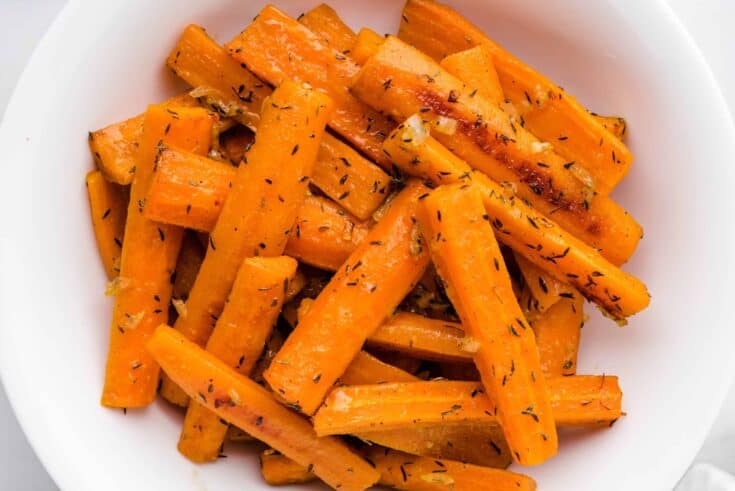 These Oven Roasted Carrots with Onions and Thyme are a simple, yet elegant side dish. A savory blend of olive oil, salt, pepper and thyme are tossed with fresh carrots. Then, the carrots are drizzled with vegetable bouillon broth and roasted in the oven until tender.