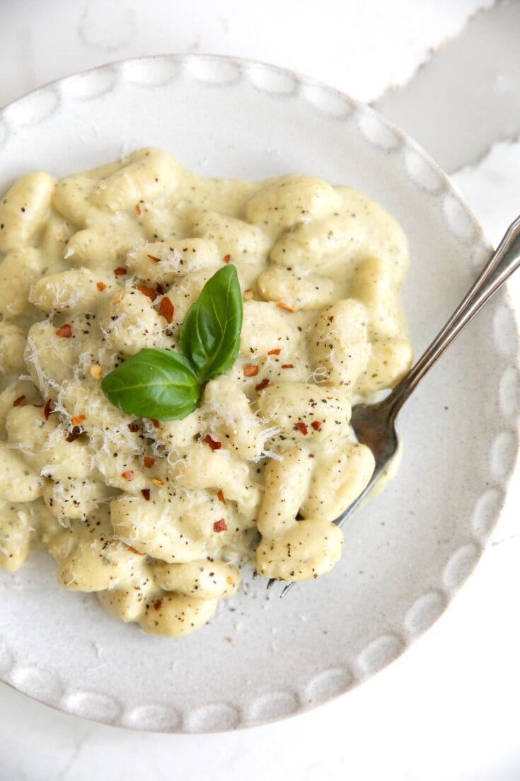 Creamy Pesto Gnocchi made with soft and pillowy store-bought potato gnocchi, basil pesto, heavy cream, and shredded parmesan. Ready in just 20 minutes, serve this easy gnocchi recipe as a side dish for scallops.