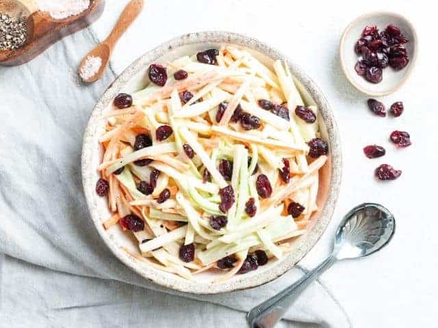 Broccoli Stem Slaw is crisp, colourful and totally delicious. The fantastic texture, bright flavours and creamy dressing pairs perfectly with the sea scallops.