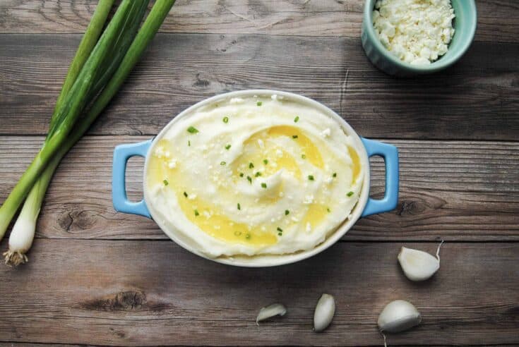 These Roasted Garlic and Feta Mashed Potatoes are creamy and fluffy with the perfect amount of salt and garlic to amp up each bite.
