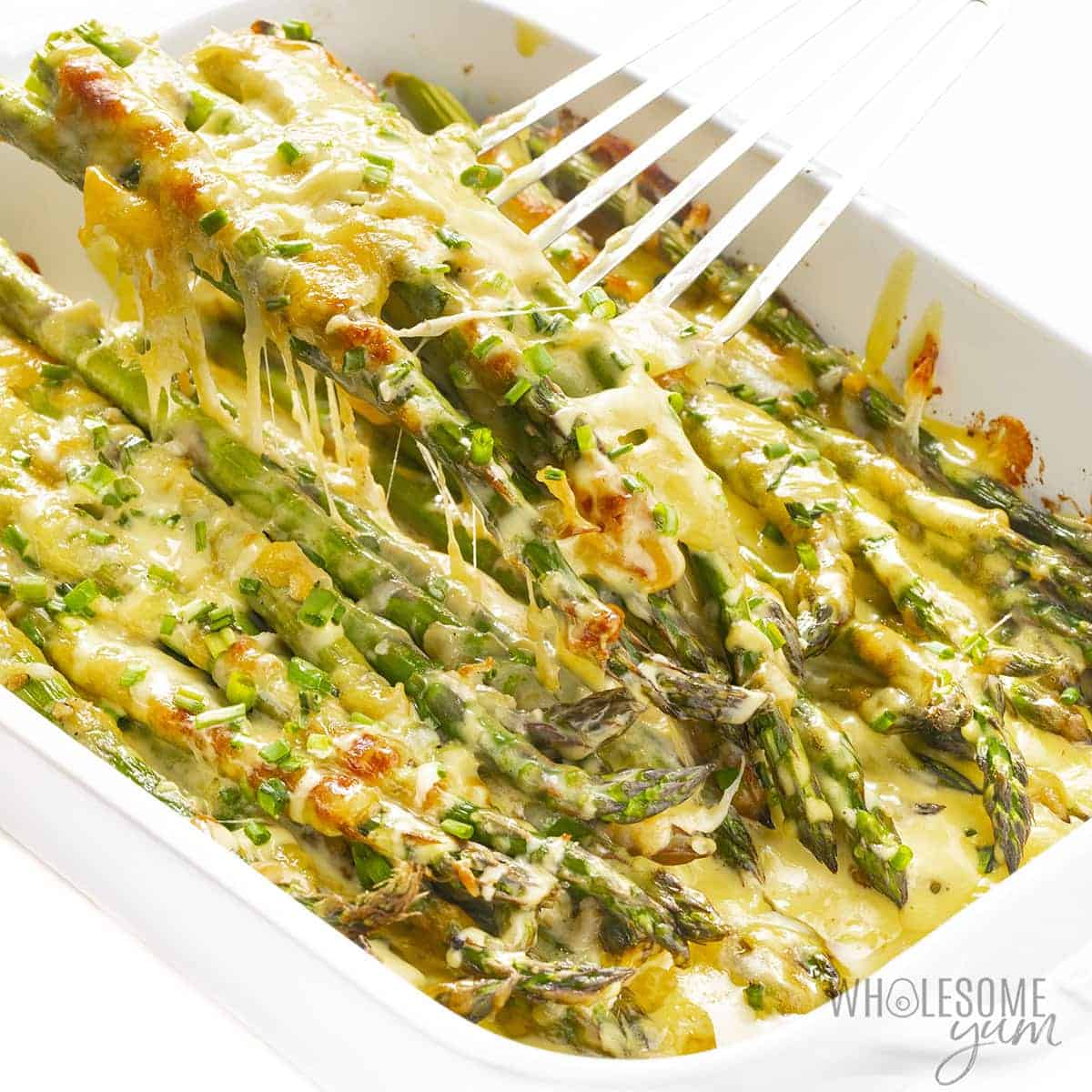 This easy, cheesy asparagus casserole recipe has layers of tender asparagus, gooey cheese, and creamy hollandaise. Ready in 20 minutes!