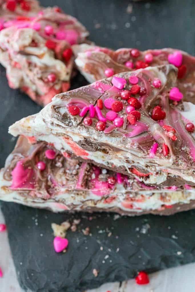 - Valentine's Sprinkles: The Valentine's themed sprinkles give this delicious milk and white chocolate almond bark a festive flare!