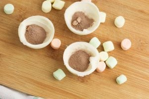 - When the chocolate is set, remove each of the chocolate pieces from the mold. Add a small amount of instant hot cocoa mix to half the pieces and top the hot cocoa mix with marshmallows.