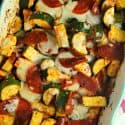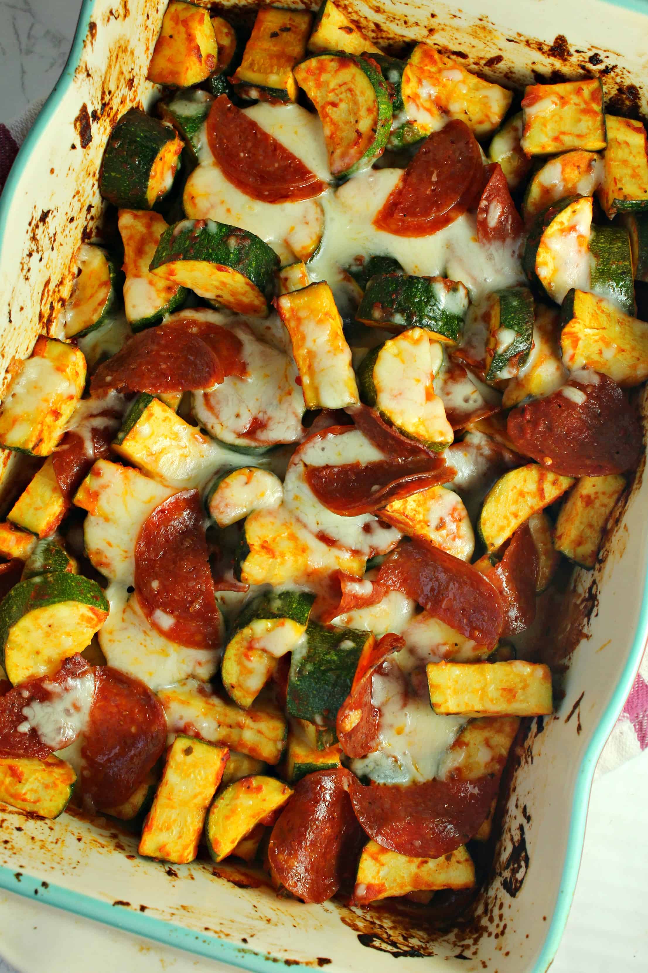 As I mentioned above, this is very simple to make! Just preheat the oven to 375 degrees. Spray a 13x9 inch baking dish with nonstick cooking spray and set aside. Wash and chop the zucchini into bite sized pieces and put in a large bowl. Pour in the pizza sauce and toss to coat. Dump the zucchini mixture into the prepared baking dish and top with half of the pepperoni.